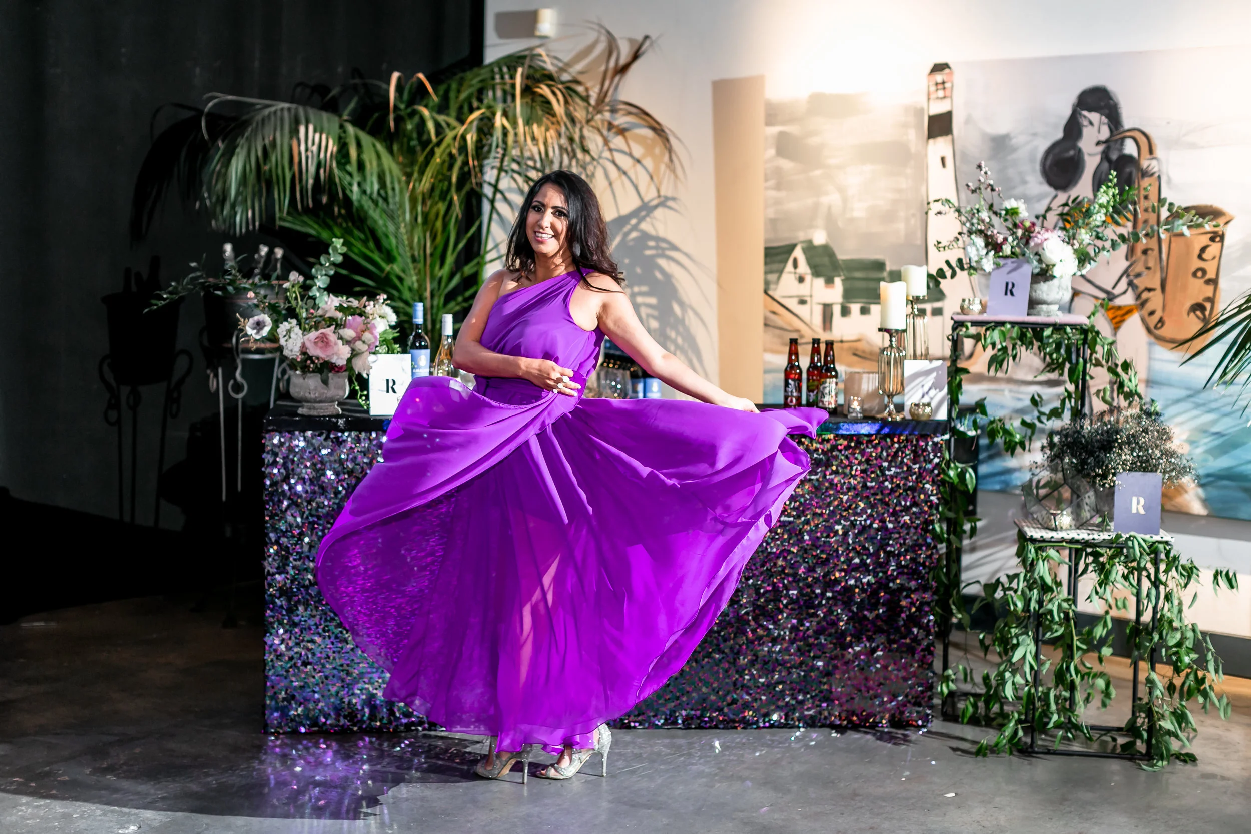 The Launch Party for Refined By Suher was hosted at Herb & Wood in Little Italy on Monday, September 17, 2018. It was a glorious compilation of purple heaven with a hanging baby’s breath chandelier, glitter bar, cheese & charcuterie platters, and wonderful wedding industry professionals. Florals provided by Organic Flora with TBD setting up the exquisite glitter bar, gift display gold shelving, and fluffy pillows to adorn the couches. Julie Ferneau was behind the camera capturing all the details of this marvelous party! There were streamers in a myriad of purple shades hanging from the ceiling to adequately express the metaphor of the evening: Refined By Suher will help you get your shine back! Your Glitter! Your Spark! Your business will fly, will flourish, and will soar to success.